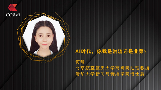 由中国科学院大学校友会、北京君和创新公益基金会联合主办,主题为“和而不同,思想无界”的CC讲坛第58期演讲2024年3月3日在中国科学院大学(北京玉泉路校区)礼堂举行。来自北京航空航天大学高研院助理教授何静出席,并以《AI时代,我们是洪流还是韭菜》为题发表演讲。